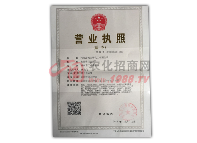 由于公司經(jīng)營逐年擴大,為了適應(yīng)市場需求和內(nèi)部管理,特將“石家莊志誠農(nóng)藥化工有限公司”的農(nóng)藥生產(chǎn)經(jīng)營改制為獨立核算企業(yè),重新登記為“河北志誠生物化工有限公司”。