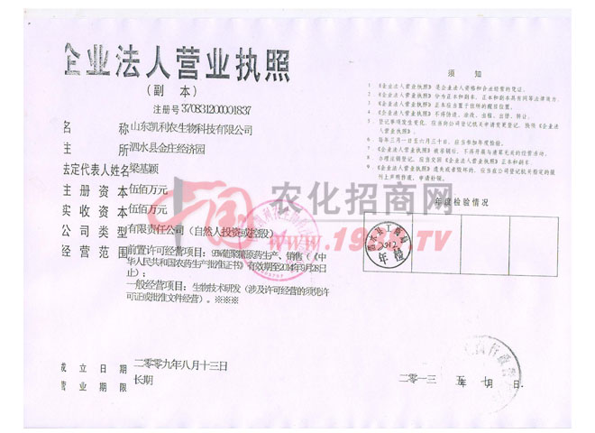 山東凱利農(nóng)生物科技有限公司坐落于山東省中南部素有“海岱名川”之譽的泗水縣,是一家集科研、生物技術(shù)開發(fā)、生產(chǎn)、銷售為一體的綜合性國家農(nóng)藥定點生產(chǎn)企業(yè),注冊資金1000萬,公司,占地面積50000㎡,固定資產(chǎn)投資2000萬元,流動資金1000萬元,現(xiàn)有辦公面積3000㎡,化驗室1000㎡,生產(chǎn)車間10000㎡,主要生產(chǎn)設(shè)備50臺,現(xiàn)有職工300人。