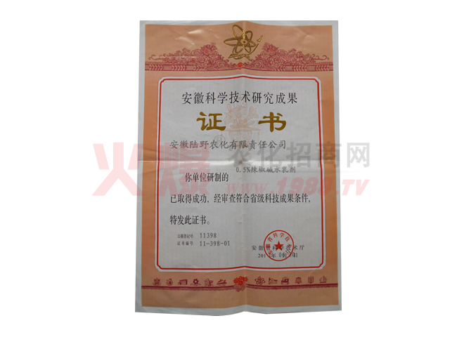 2009年以來我公司自主研發(fā)4.5%高效氯氰菊酯水乳劑工藝及技術(shù)、0.5%辣椒堿水乳劑分別獲得安徽省科學(xué)技術(shù)成果證書;